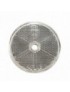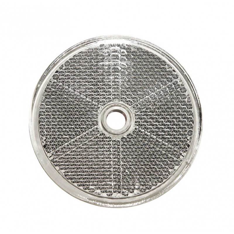 Catadiottro bianco di forma tonda con un foro di fissaggio centrale.