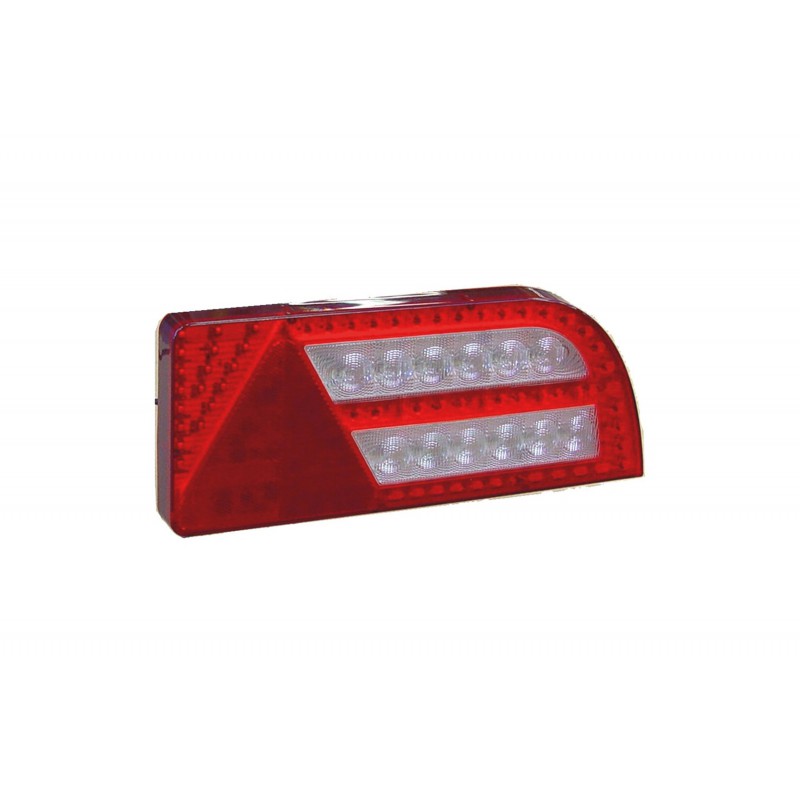Fanale posteriore cinque funzioni destro a led. Copre le funzioni di posizione, stop, freccia, retromarcia e retronebbia; ha anche il catadiottro triangolare incorporato. Funziona sia a 12V sia a 24V.