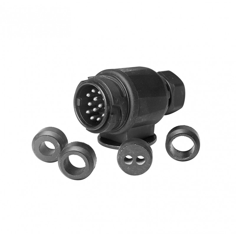 La spina 12V a 13 poli con corpo in plastica per collegamenti ISO 11446 è utilizzata principalmente per il settore rimorchi leggeri. I contatti sono a vite con serraggio cavo.